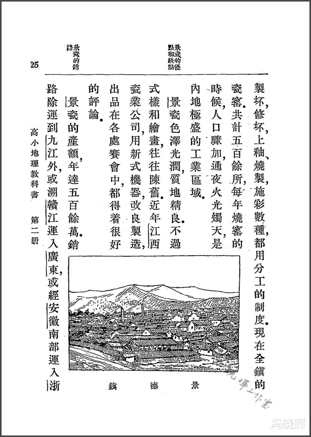 从南昌渡鄱阳湖,溯昌江,到景德镇。景德镇属浮梁县境,千余年前就因制瓷器著名;现在我国所用的瓷器,大半是这里出产。造瓷的瓷土,由鄱阳湖沿岸和安徽的祁门运来。制瓷手续很多,大别为淘泥、制坯、修坯、上釉、烧制、施彩数种,都用分工的制度。现在全镇的瓷窑共计五百余所,每年烧窑的时候,人口骤加,通夜火光烛天,是内地极盛的工业区域。