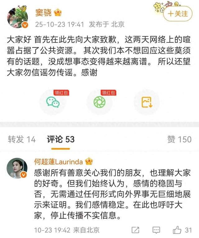 二、何超莲紧随其后:感情不用证明,但谣言必须澄清窦骁刚发完文,何超莲立马跟上!她先在老公评论区留言,又转发了微博,笑眯眯地说:“我俩好着呢,本来不想搭理谣言,可传得太离谱了,必须站出来说清楚。”