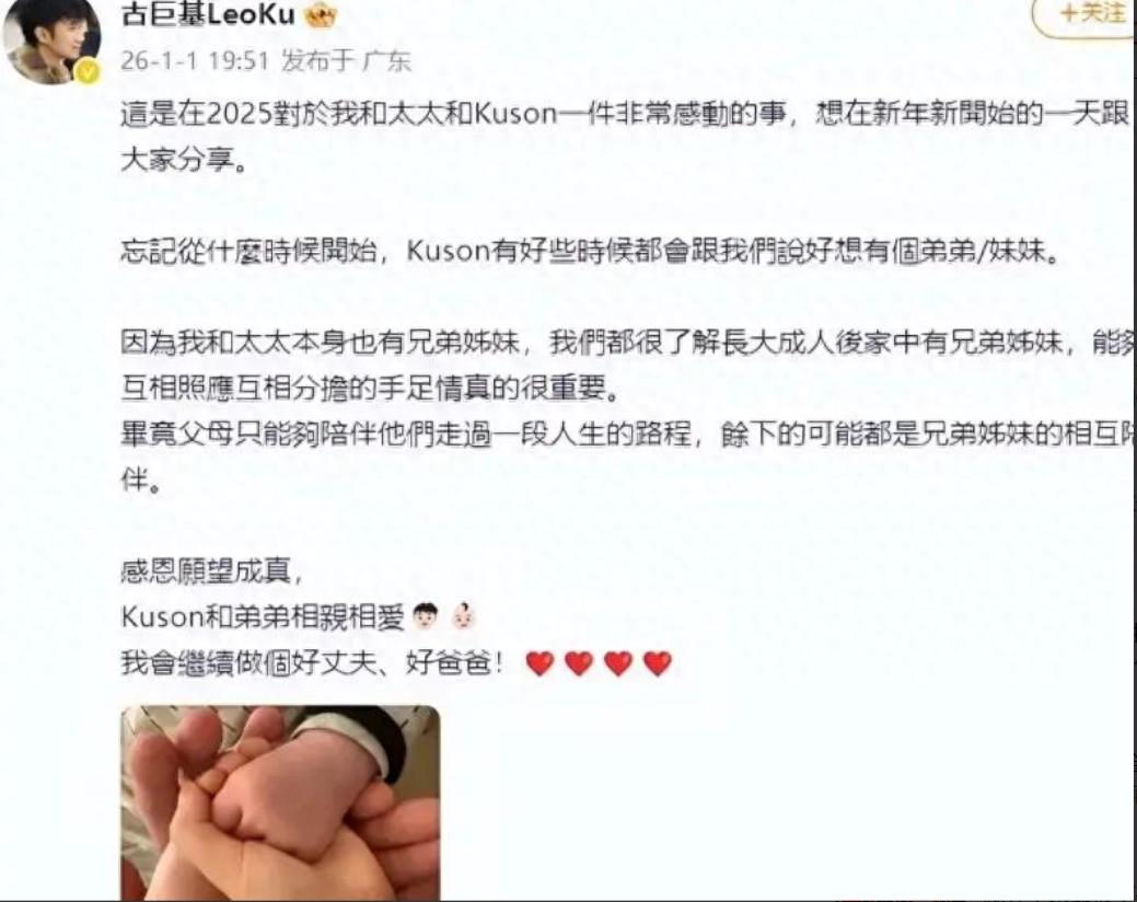 既然这么大年纪了,甚至大儿子都已经慢慢长大了,为什么还要这么拼? 面对可以预见的舆论风暴,古巨基的长文里,给出了一个最朴实却最戳心的答案:这所有的冒险,都是为了圆大儿子Kuson的一个心愿。 Kuson不止一次地跟爸妈念叨,想要个弟弟或妹妹。小孩子的世界很单纯,他只是想要个伴。但这对父母听进去了,而且听得很重。 古巨基这番话,真的说到了无数二胎家庭的心坎里。加上他自己和太太也都有兄弟姐妹,他们很了解长大后家里有兄弟姐妹,可以互相照应互相分担的手足情真的很重要”。