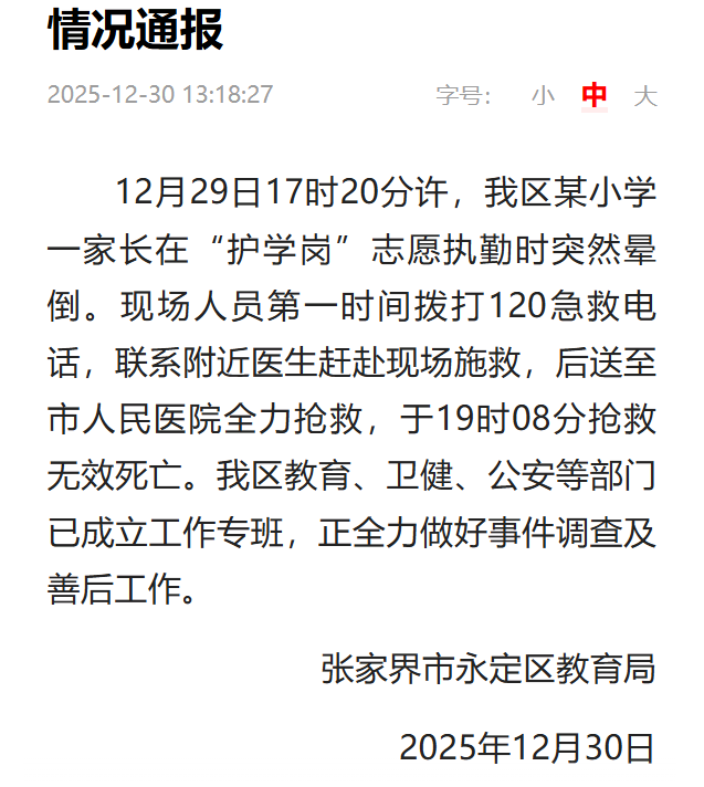一场本是出于责任与爱心的志愿护学,却酿成了令人痛心的悲剧。12 月 29 日下午,湖南省张家界市永定区天门小学一名家长,在参与护学岗志愿执勤期间意外晕倒,经全力抢救无效不幸离世。这一消息传开后,引发社会各界对护学岗安全保障、家校协同责任等问题的关注,目前当地多部门已成立工作专班,全力处理事件调查及善后事宜。