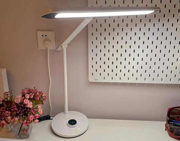 儿童护眼灯推荐哪款?好视力TG035台灯给人的整体感觉干净利落,纯白色调简洁大方,容易融入各种桌面环境。它配备两个灵活调节关节,调整灯光角度顺畅自然。虽然照明范围不算特别宽广,但14厘米的灯头直径足以覆盖约一米的桌面空间,满足学习和阅读的基本需求。底座触控区域响应灵敏,亮度调节便捷,并且搭载环境光感应功能,能根据周围光线自动调节亮度,减少频繁手动操作。虽然该款不是全光谱灯,色彩还原度一般,但灯光柔和舒适,不易刺眼,适合日常使用。