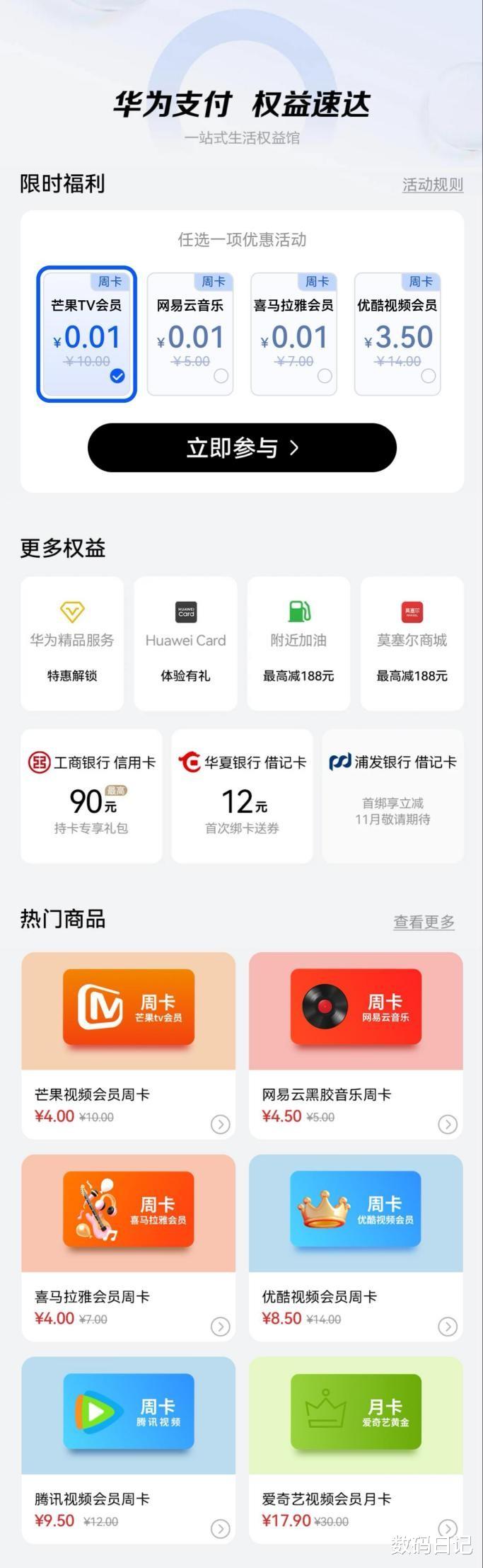 “淘”完好物,付款就是最后的乐趣了。这里我必须强力推荐华为支付,它的“一站式生活权益馆”简直是宝藏。双11期间,我抢到了1分钱的芒果TV周卡,还有网易云音乐会员也是超低价。在华为商城购物用工银信用卡支付,还能享受10-40元优惠券包,领取路径:桌面右滑 > 搜索华为支付,快乐体验一下华为支付吧!