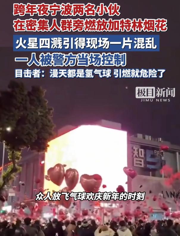 当时,宁波广场气球齐刷刷飞向夜空,全场欢呼,两名男子突然掏出加特林烟花,对着漫天气球扣动扳机。