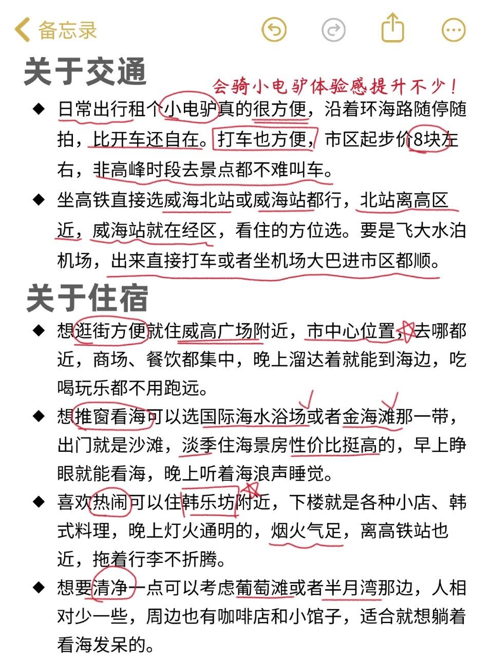 ✅️第一天: 上午高铁到威海站,出站打车去酒店放行李,直奔火炬八街!虽然人多但彩色房子配大海确实出片📸 沿着国际海水浴场溜达,沙子细软,踩水舒服。下午骑车去金海滩,人少一点,接着海源公园🏜渔船停得整整齐齐,拍照好看。傍晚猫头山观景台吹风看日落,视野开阔~