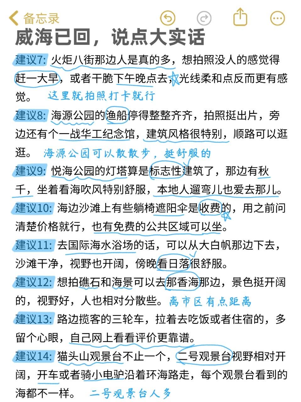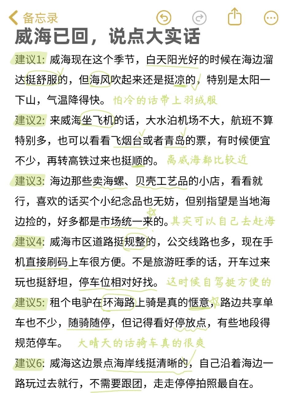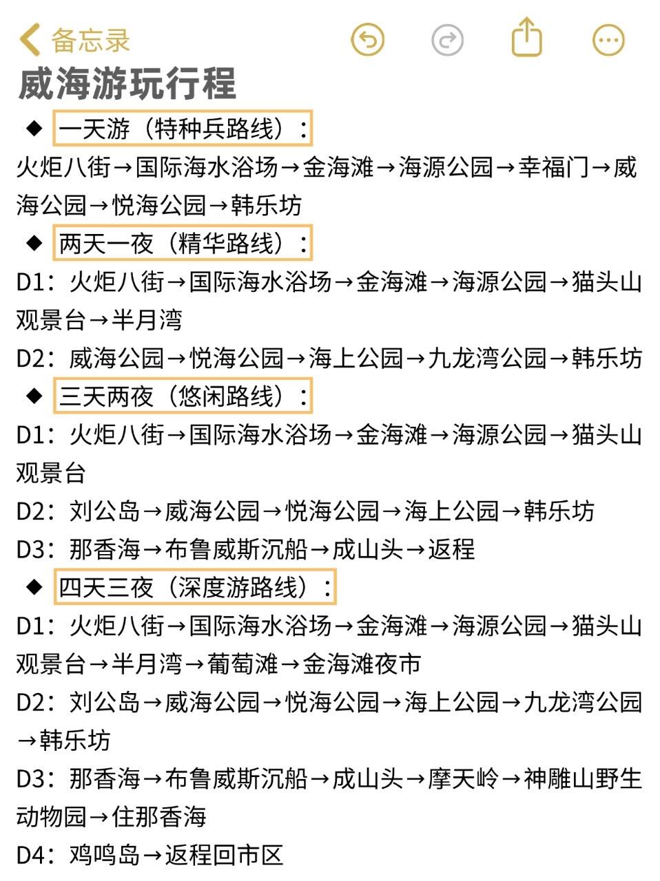 ✅️第二天: 早起去刘公岛,坐船🚢十几分钟,岛上历史氛围浓,甲午战争纪念馆值得看。下午回市区逛威海公园,大相框打卡📷 沿着悦海公园走到灯塔,秋千上坐会儿吹海风。海上公园有沙滩和桥,傍晚韩乐坊夜市逛逛,买了群香玛特打糕,糯叽叽的不甜。✅️第三天: 打车去那香海,钻石沙滩浴场确实漂亮,沙子细,海水清,呆坐着看海舒服🏖️ 布鲁威斯沉船巨大一艘,岸边能喂海鸥🕊。下午成山头,海边悬崖壮观,风大得穿厚点。傍晚高铁返程,三天刚刚好~