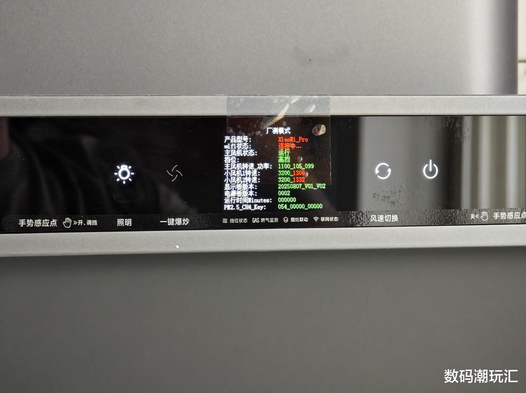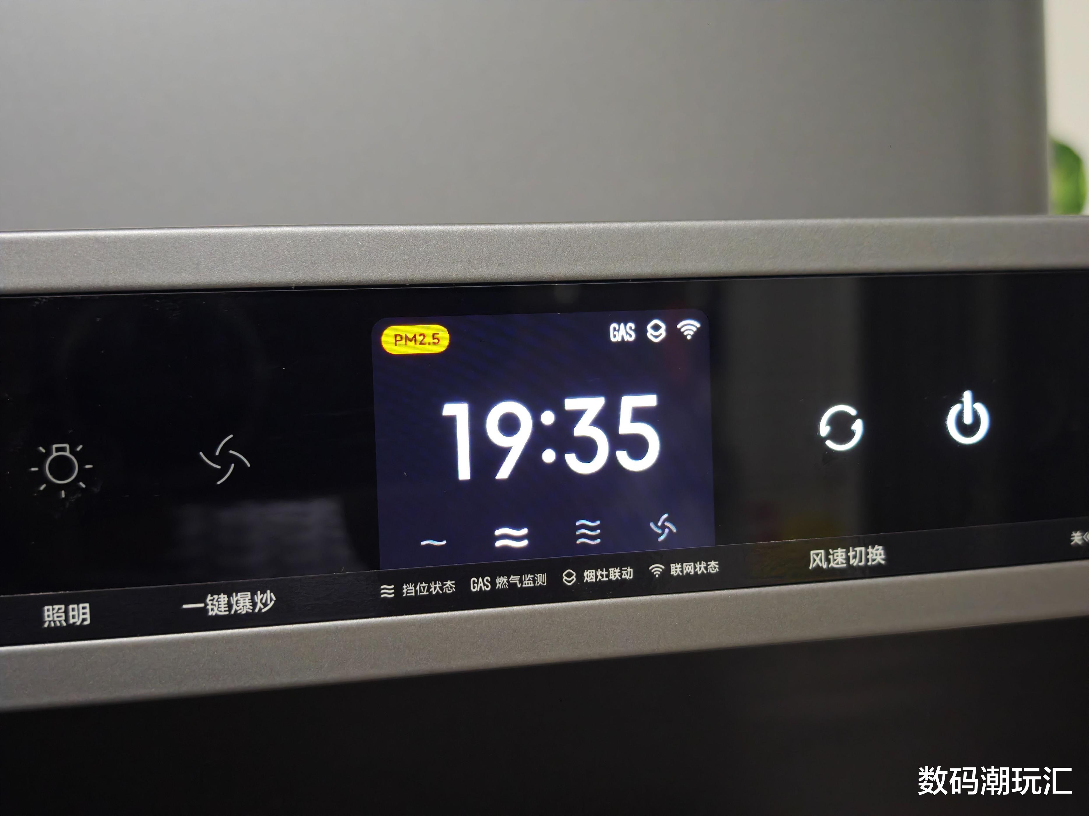 机身中部设有高清显示屏,位置处于烹饪者视线范围内,无需弯腰即可查看实时信息,包括 PM2.5 数值、排烟档位、燃气监测状态、延时净味倒计时等,让 “看不见的污染” 显形,方便我们随时掌握净烟效果。显示屏下方集成了操作按键,按键反馈清晰,即便手上沾有油污,也能精准操作,避免误触。