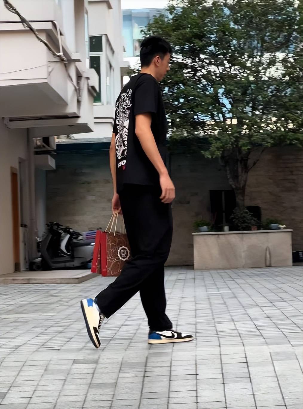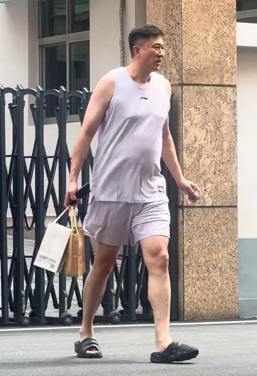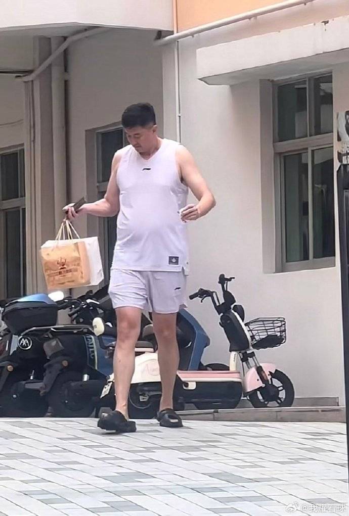 可能是背心款式太小的缘故,杜锋指导的肚子还是非常显眼的。加上是休息天,天气又热,穿着简简单单,自己穿着舒服就可以了。