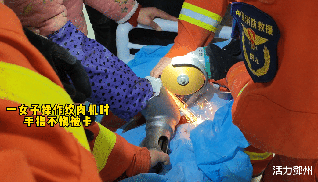 只见女子手指被绞肉机死死“咬”住