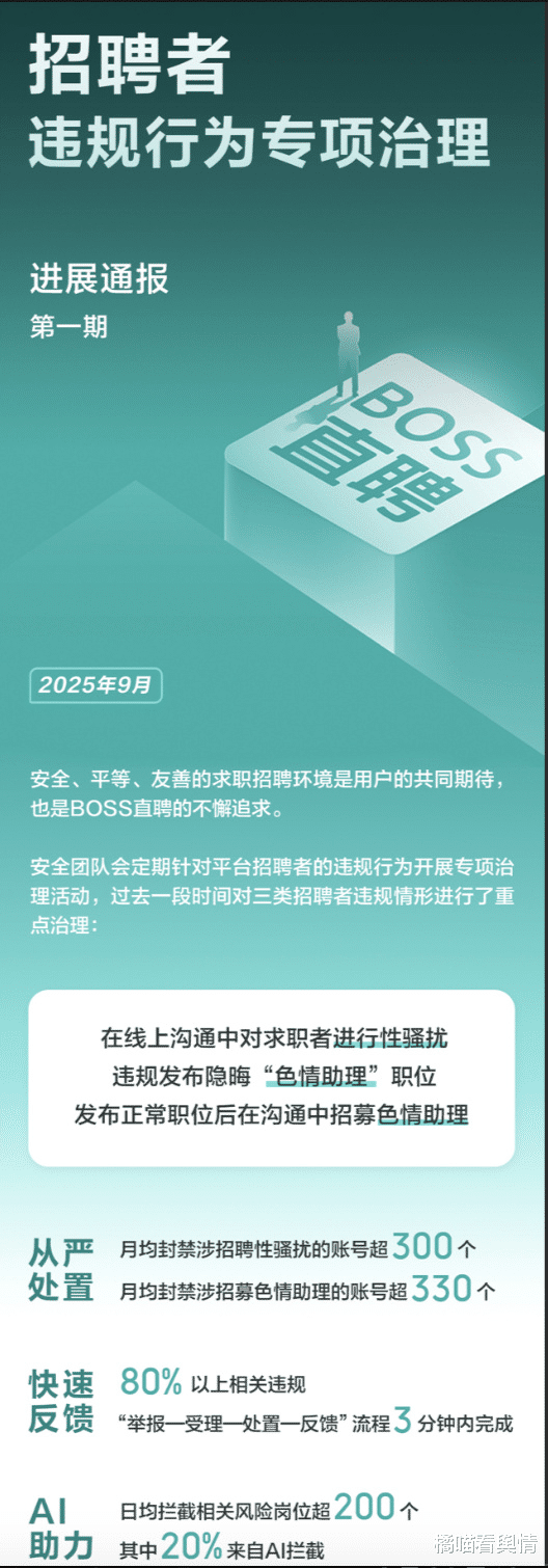 日前,BOSS 直聘发布《招聘者违规行为专项治理进展通报》,聚焦在线性骚扰、隐晦“色情助理”岗位发布等三类违规情形,披露了2025年6-8月的治理成果。