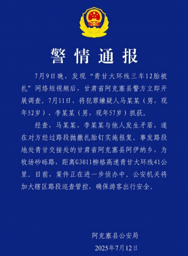 来看一下警方的通报,扔钉子的人一个52岁,一个57岁,因为和其他人发生矛盾,便在对方经过路段抛洒轮胎钉实施报复。