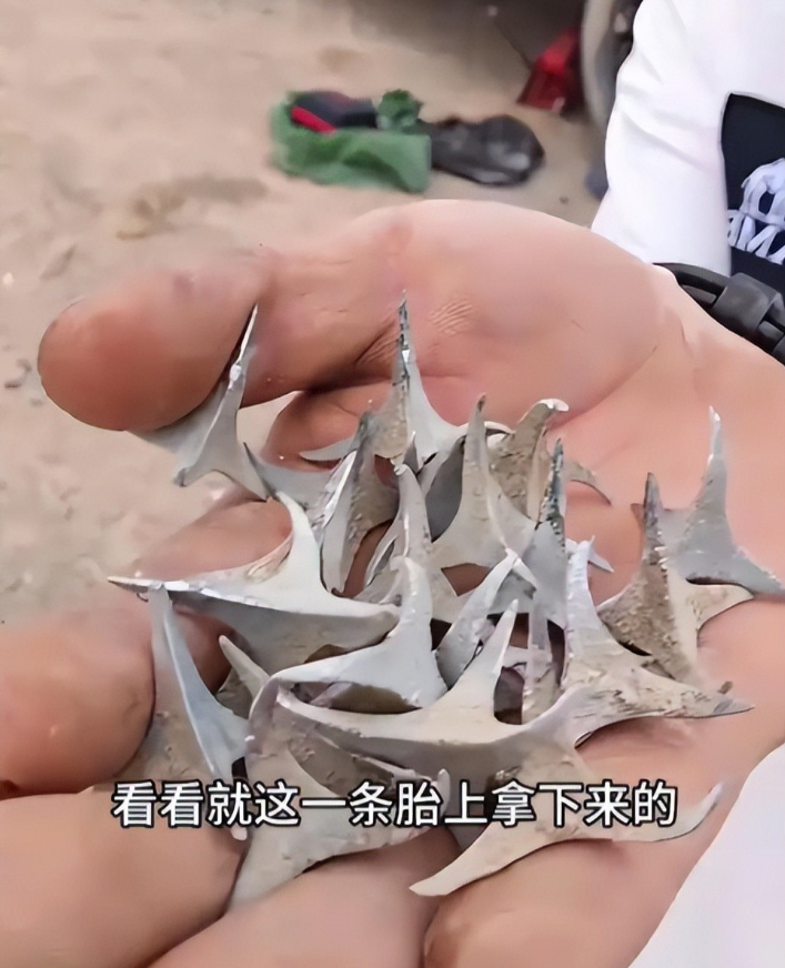 这就是轮胎扎破后的场面,光是一条胎上的三角钉就是满满一手心。
