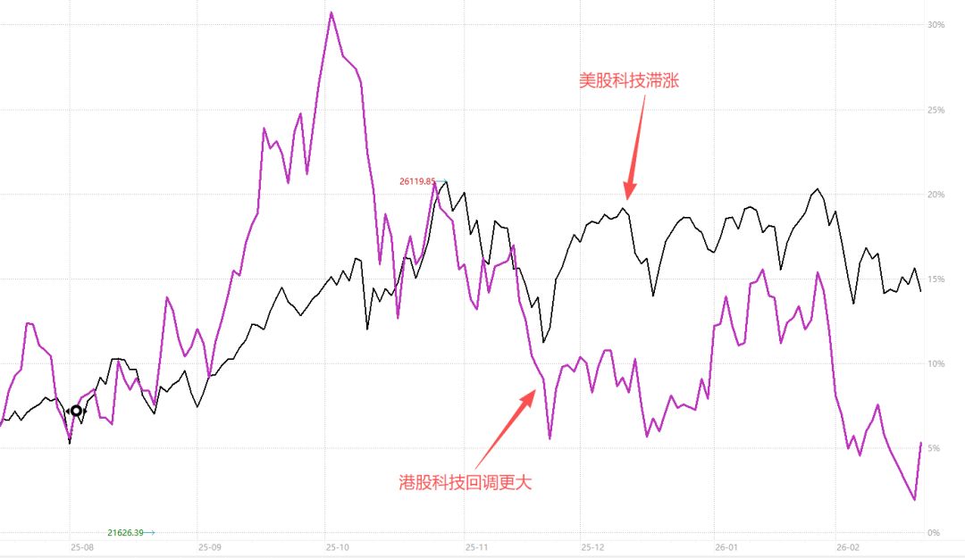而你去对比一下最近几个月股价。美股科技其实也是滞涨,也是回调,但港股科技回调幅度明显更大。
