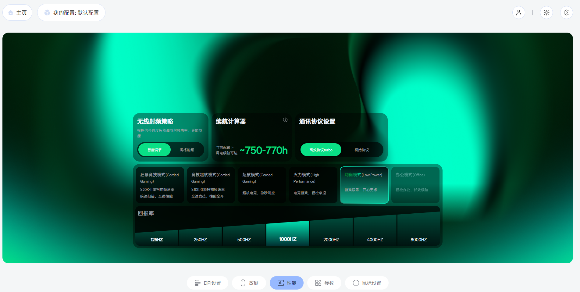 它的驱动是A Hub驱动,界面很简洁,操作起来不复杂,平时常用的功能都有,比如DPI和回报率调节、10个按键的宏编程,还有6种性能模式可以切换。