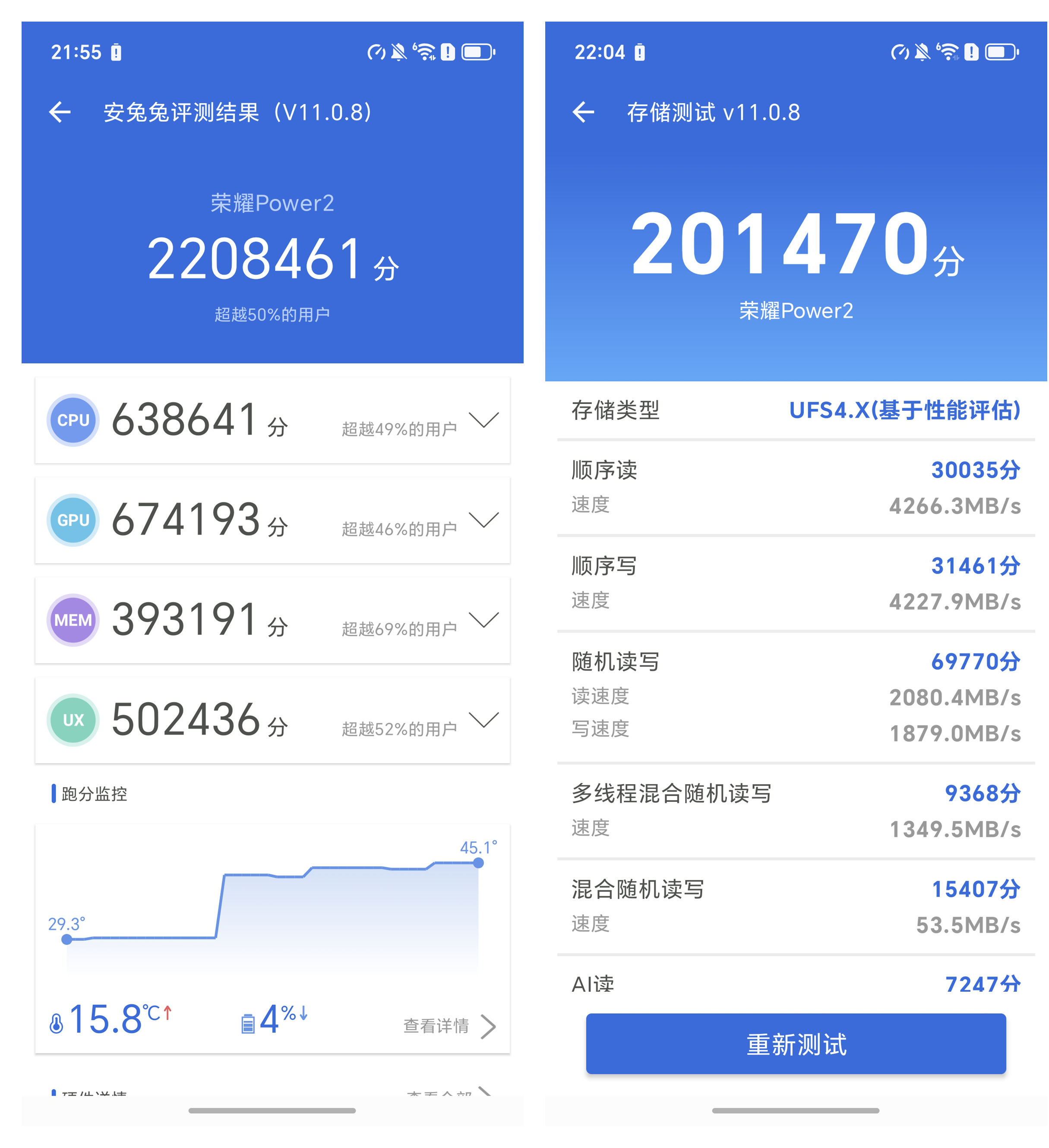 说下大家关心的性能,Power2搭载的是全球首发天玑8500 Elite处理器,这颗芯片主打性能和功耗均衡,台积电4nm工艺,安兔兔跑分可以轻松超220万+,这颗芯片的性能没的说,很强,并且功耗还很稳定,所以才做到了如此长的续航时间。