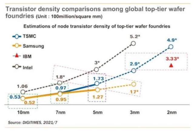 于是接下来在10nm时,还马马虎虎,勉强能够和台积电拼一拼,但在7nm时,就被台积电甩在后面了。