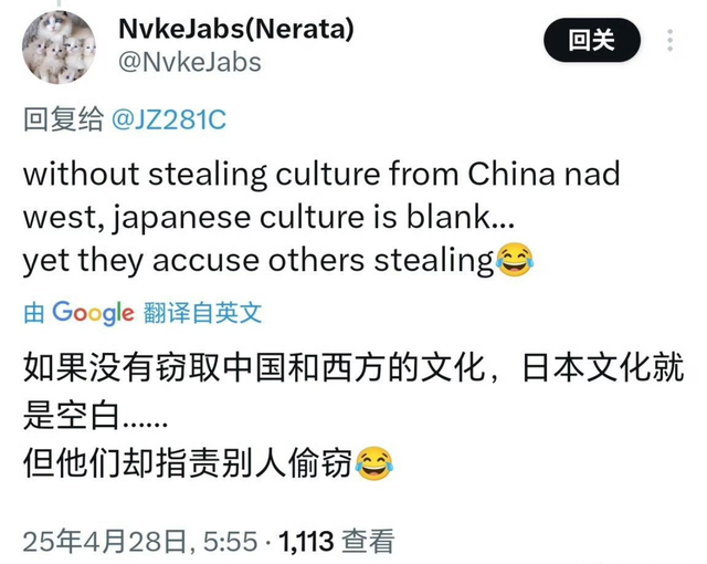 另一位网友表示:“如果没有窃取中国和西方的文化,日本文化就是空白..……但他们却指责别人偷窃!”