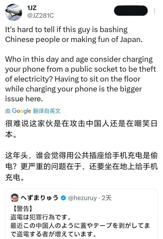 近日,一位中国人因为在日本的某舞蹈学校的公共插座上给自己的手机充电被日本博主曝光了,并且日本博主还给这位坐在地上等待手机充电的中国人安上了“偷电”的罪名,这一事件在日本获得了日本网友的广泛关注,一时间闹得沸沸扬扬,现在甚至已经传到了全世界了!
