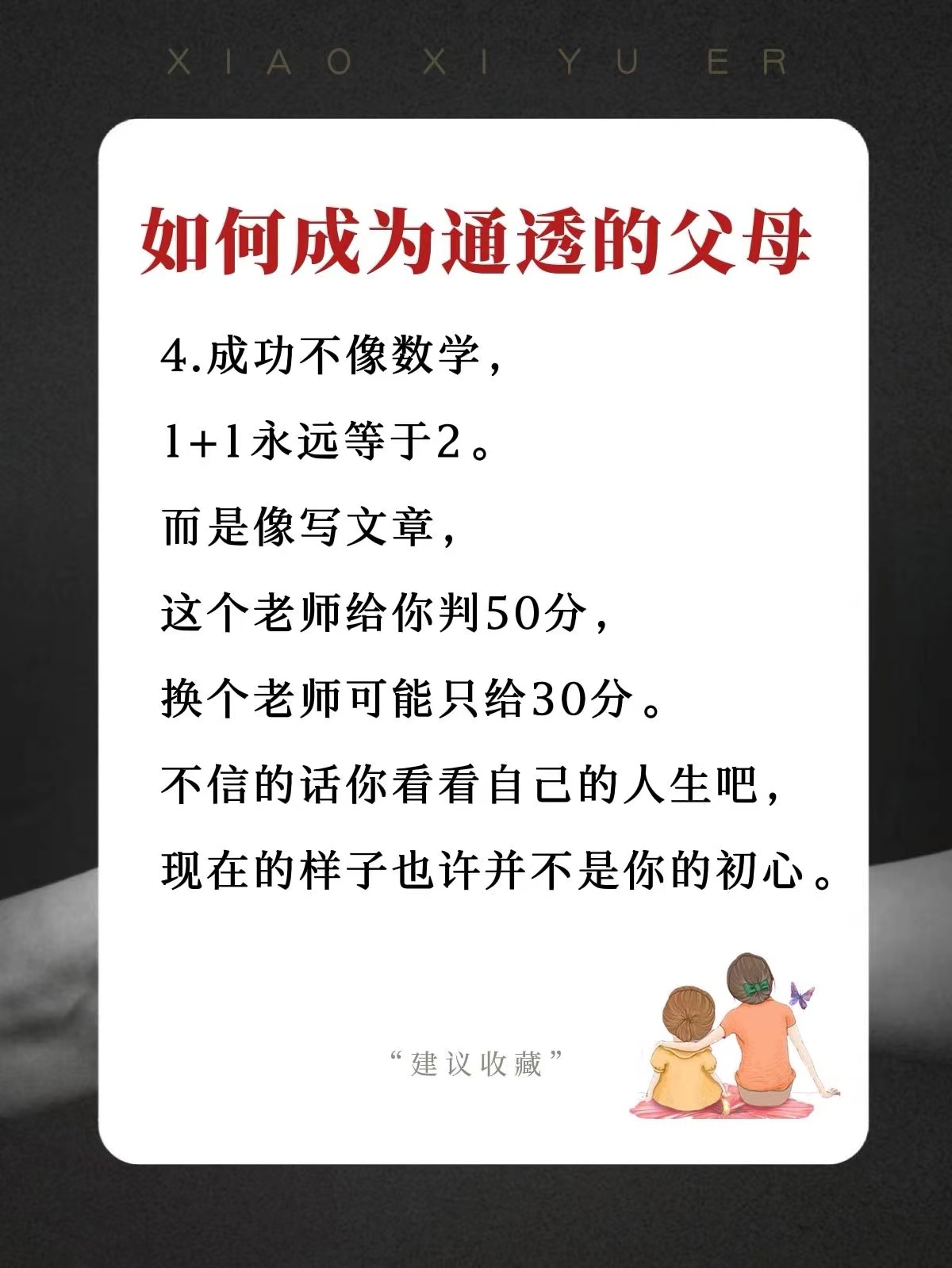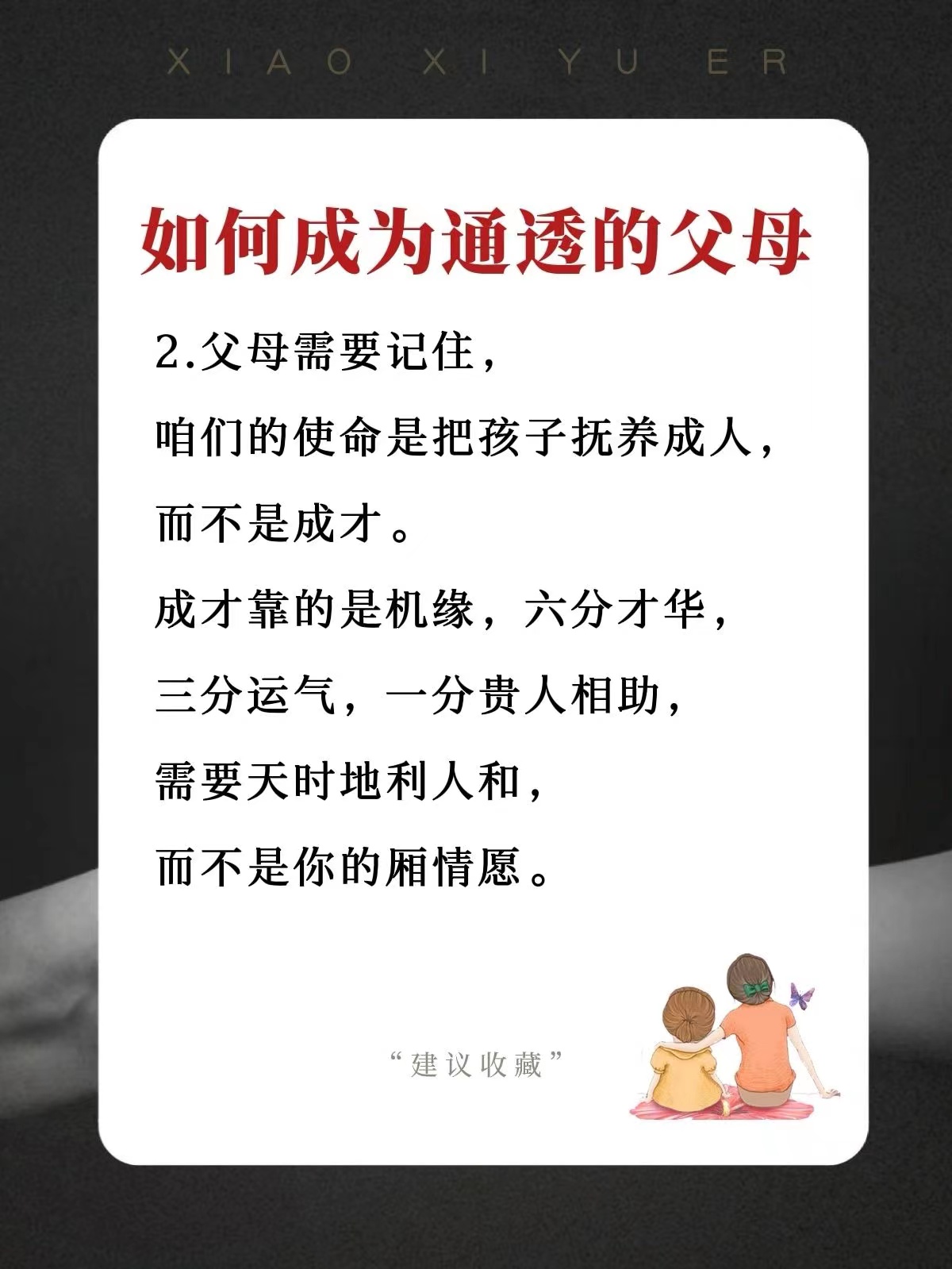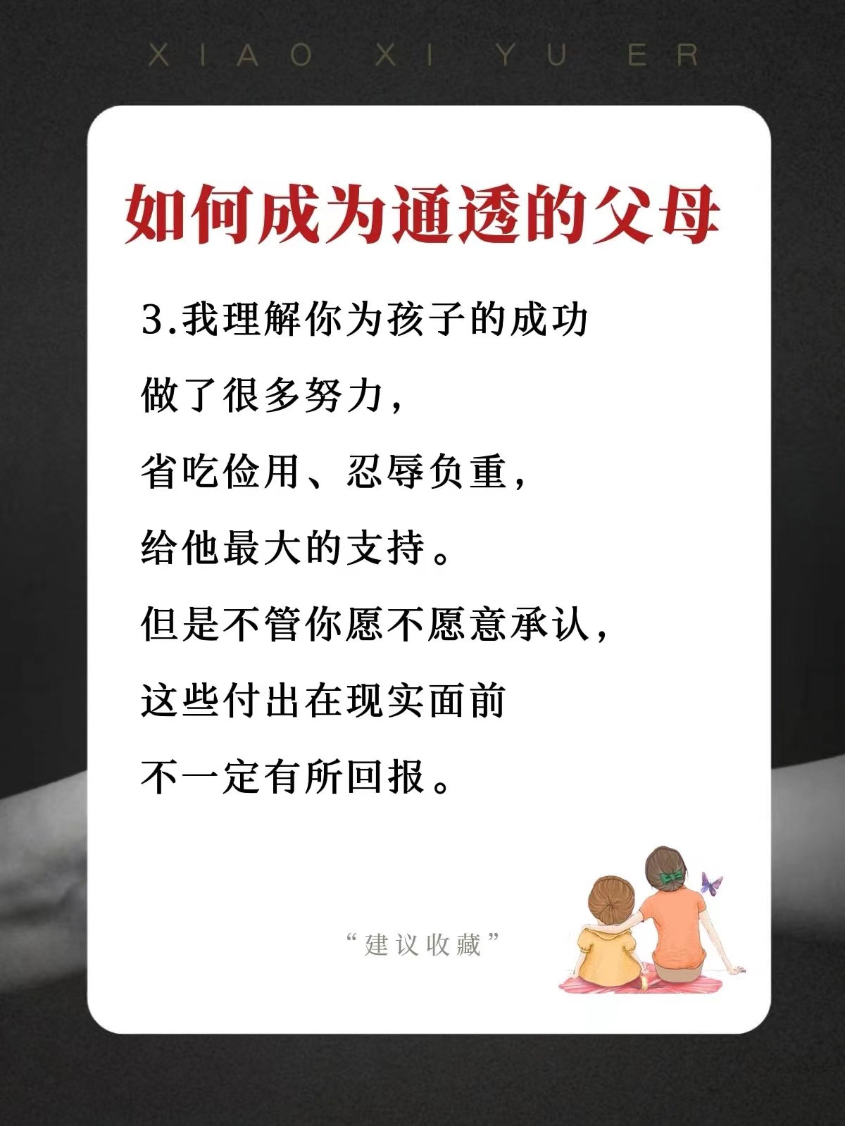 我们理解你为了孩子的成功做了很多努力,省吃俭用、忍辱负重。给TA最大的支持。但是不管你愿不愿意承认,这些付出在现实面前不一定有所回报。