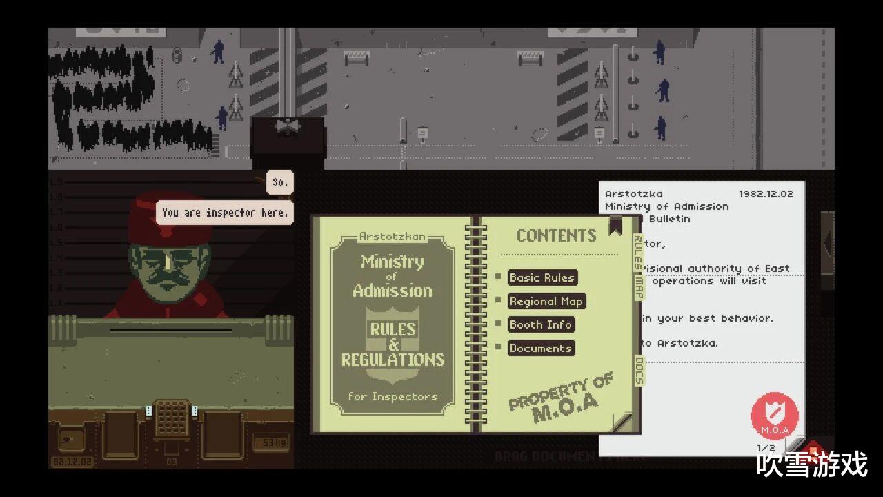 《Papers, Please》的核心玩法独树一帜:你扮演一位虚构国家“阿什托兹卡”的边境检查员,日常工作就是审核入境者的文件。