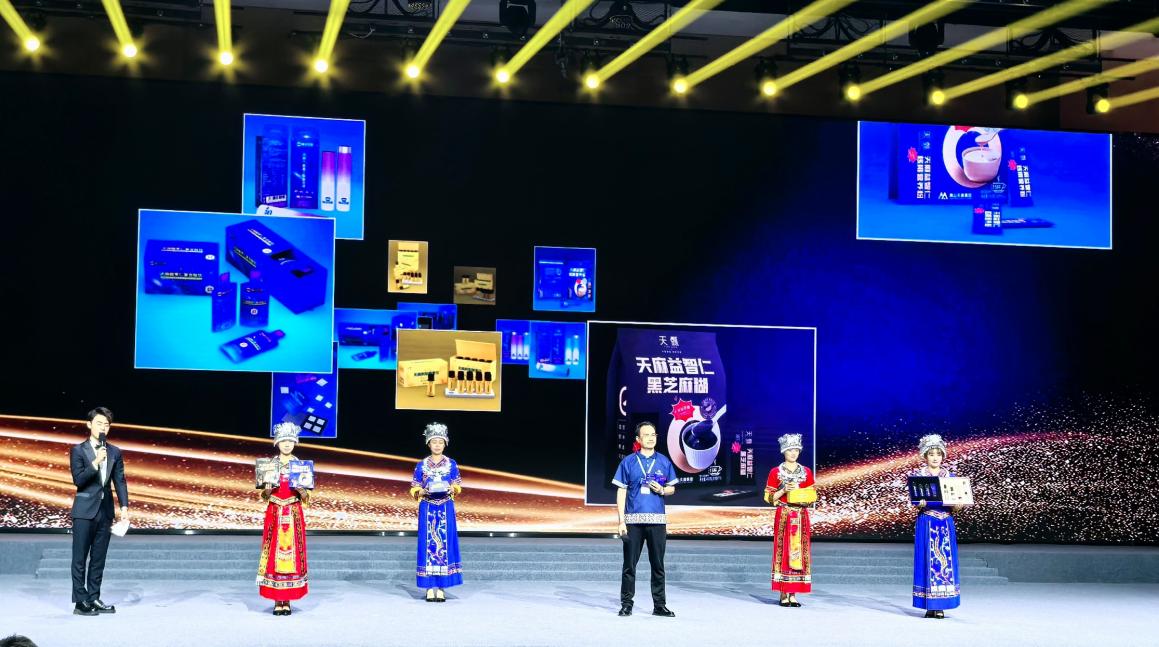 贵州两山天麻产业集团精心呈现了天甄牌康茶、养酒、药食、美妆四大板块多款天麻系列产品。这些走秀产品均为集团主推的王牌产品,涵盖了即将推向市场的天麻康茶、药食等新品。产品紧密围绕毕节林下仿野生天麻的高品质特性进行研发与设计,在包装上融入贵州的民族、生态与文化符号,既凸显了产品天然、健康的属性,又展现出浓郁的地域文化特色。