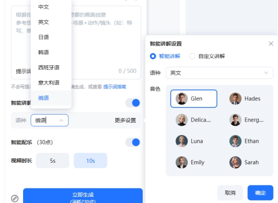 最后一步:生成视频。这一步就很简单啦,,选好你想生成多长时间的视频就可以了(现在只支持 5 秒或是 10 秒),再点一下【立即生成】按钮,一个带有音效带旁白的视频就这么诞生咯~