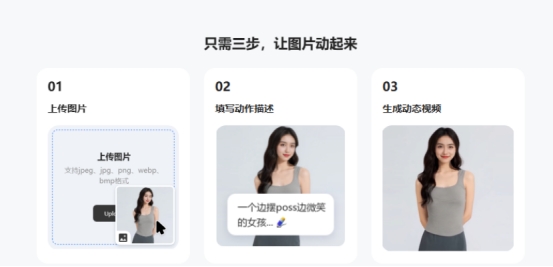 用户可以上传自己喜欢的照片当作视频素材,平台支持 jpeg、jpg、png 等多种常见文件类型;图片不超过 10m 大小即可,并且尺寸必须大于等于 300px*300px 小于等于 1024px*1024px;