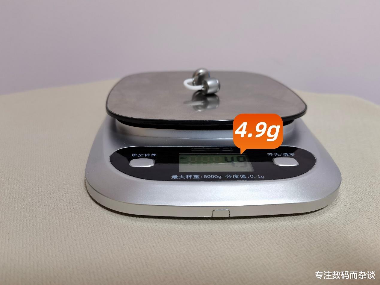 取出耳机,第一感慨就是太轻盈了,特地称了一下,仅有4.9g,可以说是对耳朵相当的友好啊。在设计方面,2.5mm错位构造,夹到耳廓上稳定牢固,而且还不夹耳;另外,∠12弧面的耳托,增加了耳后的支撑,舒适度直线上升。