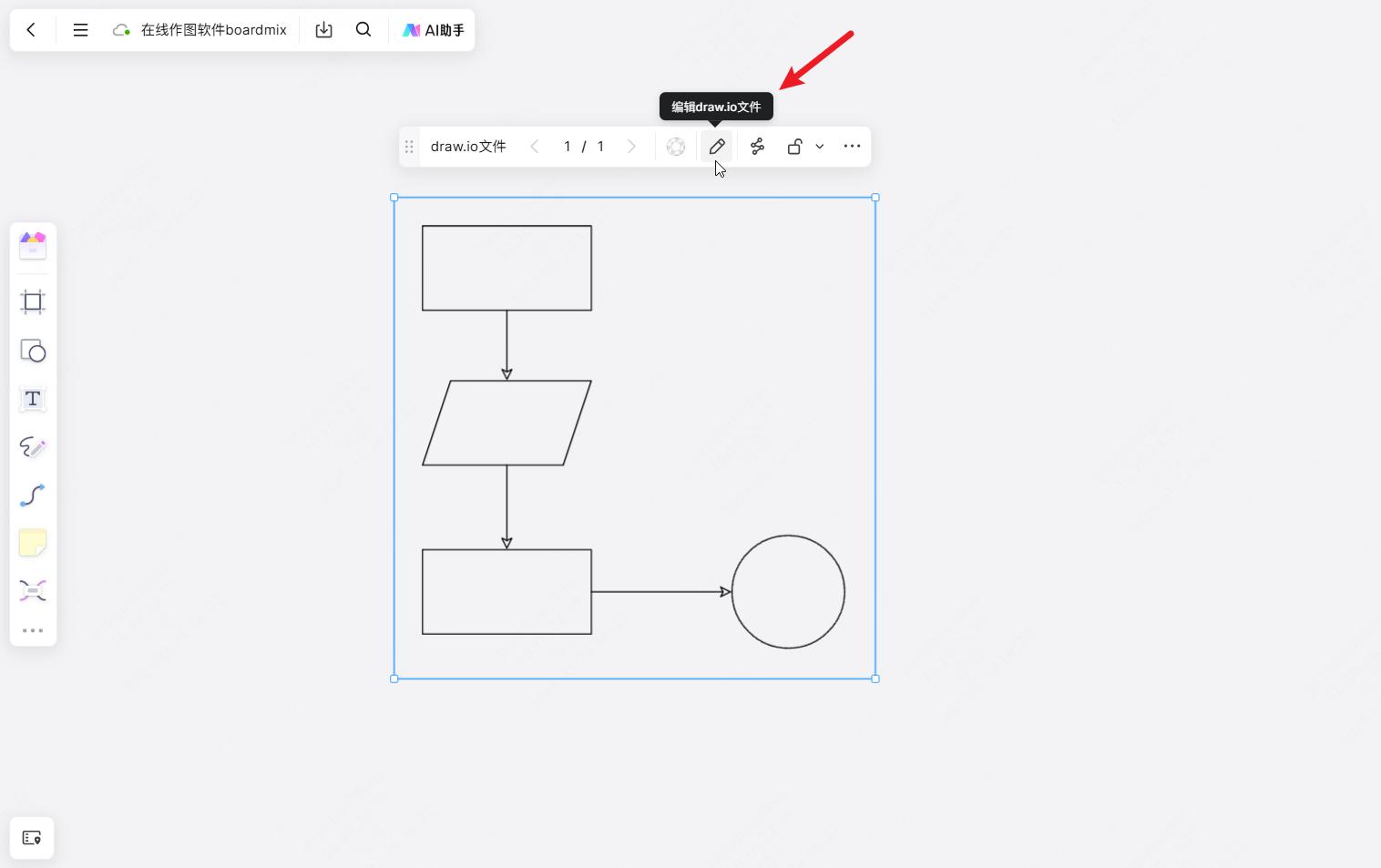 如果想修改编辑刚绘制的图形,可单击选中boardmix画布的drawio文件,点击“编辑drawio文件”选项,即可再次进入drawio编辑界面,方便我们多次修改图形内容。