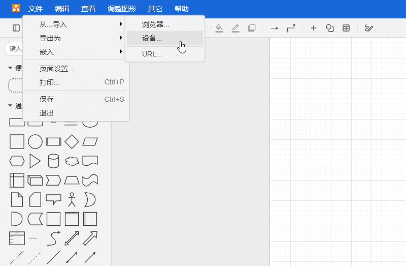 呈现在面前的,就是熟悉的 drawio 绘图界面,想要打开本地的 drawio 文件,可以点击左上角的“从…导入 > 设备”,上传本地的 drawio 文件,即可在线查看或编辑。