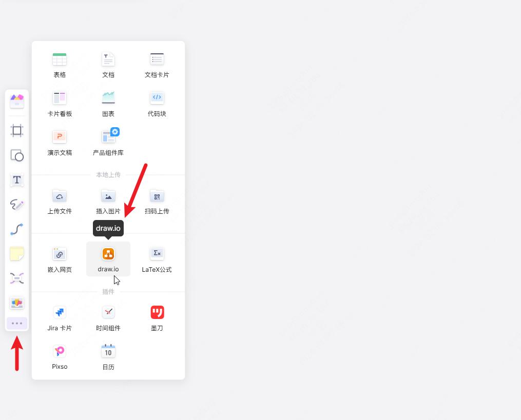 进入到 boardmix 白板的编辑界面,点击左侧工具栏末尾的 “…”,打开更多工具,选择内嵌分类下的 drawio,稍等一小会,会在 boardmix 内直接打开 drawio。