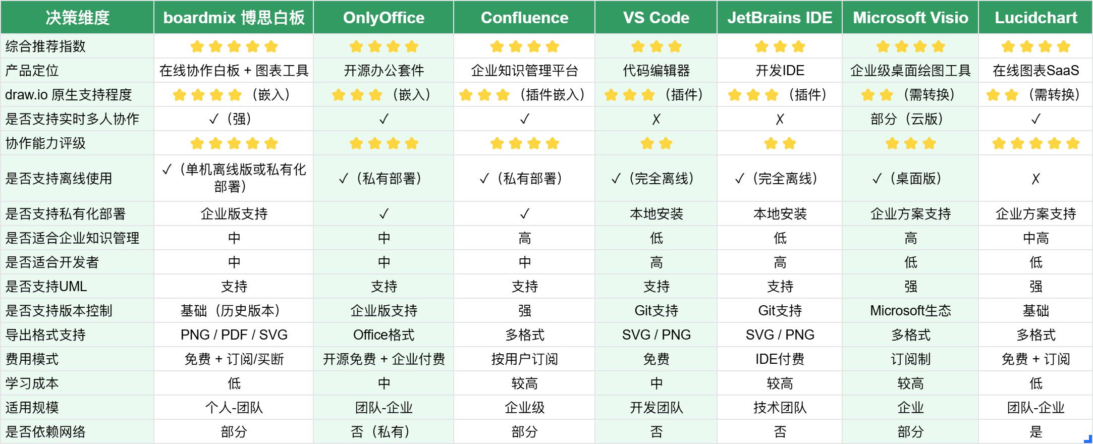打开drawio文件的工具选型建议为了帮助你更直观地选择合适的打开drawio文件的工具,我们从drawio支持程度、是否支持实时协作、是否支持离线使用、是否支持私有化部署、学习成本等多个维度进行了详细对比: