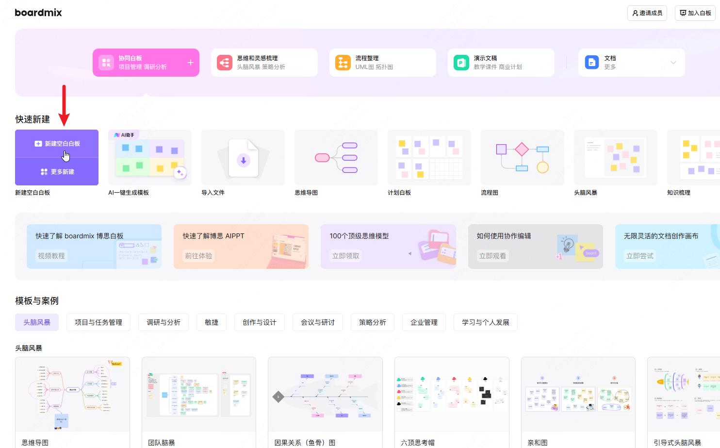 点击 boardmix 工作台的“新建空白白板”,创建一个空白的 boardmix 文件。