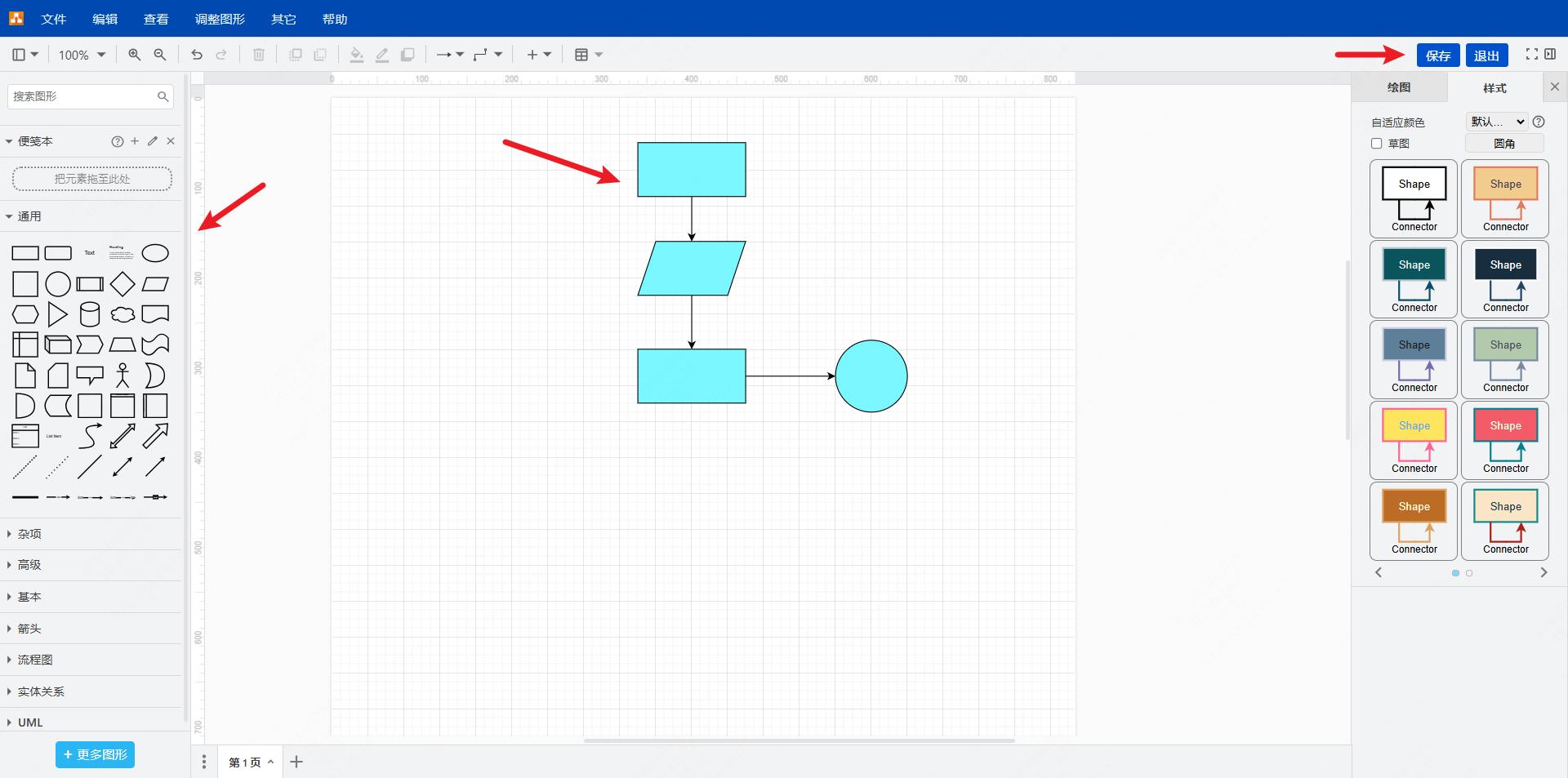 另外,如果想要在线画图,左侧是drawio内置的各种图形,拖拽到中间的画布,即可在线作图,完成后点击右上角的“保存”按钮,会以 drawio 文件的形式嵌入 boardmix 的无限画布。