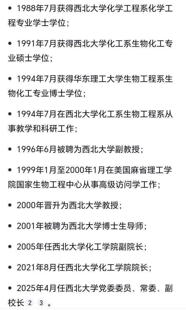 从履历来看,范代娣出生于1966年,今年58岁,22岁毕业于西北大学,28岁在华东理工大学获得博士学位。她是中国第一位生物学女博士,毕业后回到西北大学任教。她的工作能力出色,34岁被评为教授,第二年成为博士生导师,38岁担任化工学院副院长。