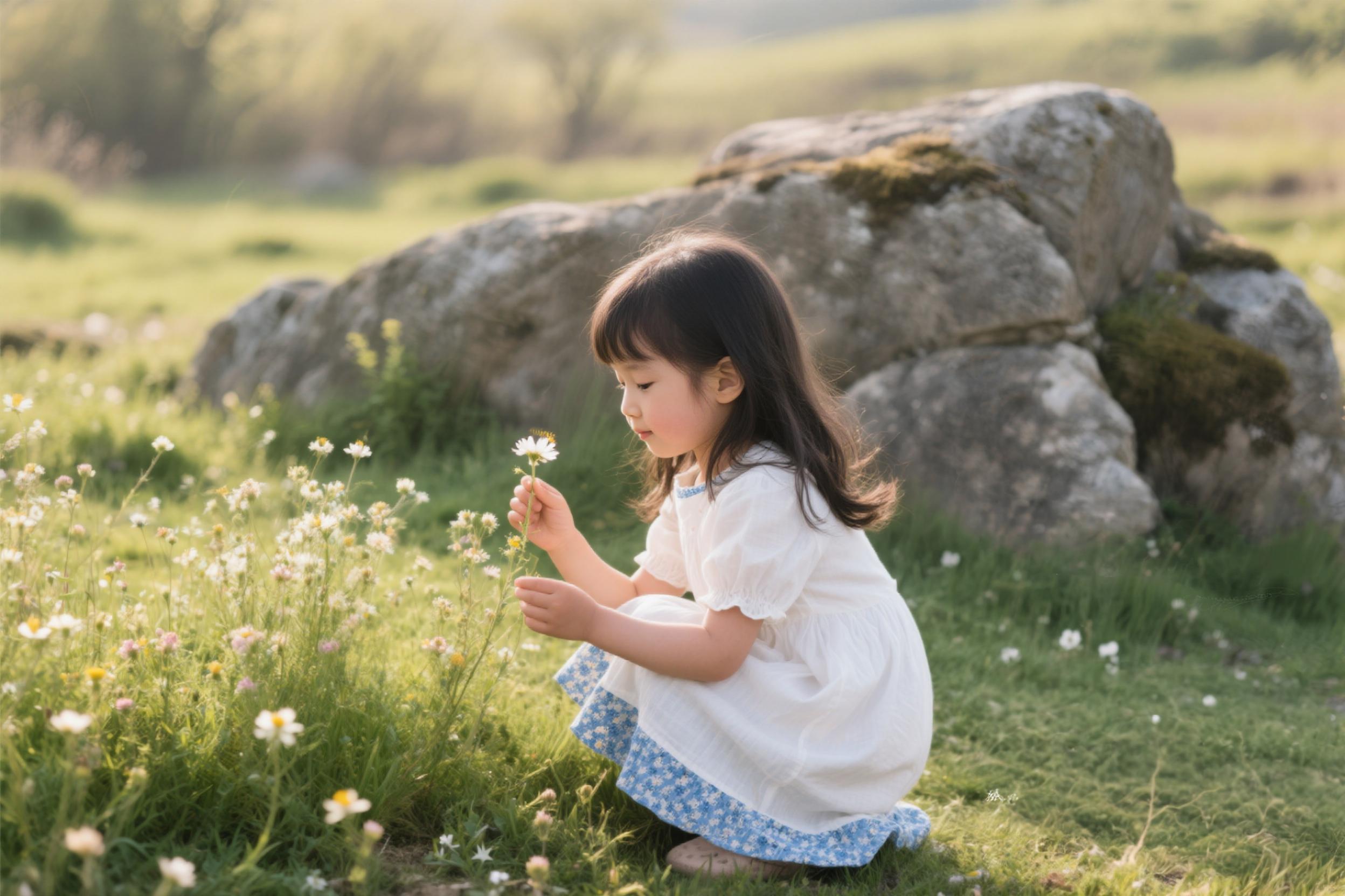 孩童蹲近偷偷采,