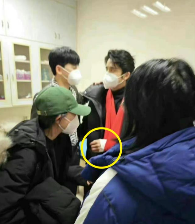 张新成穿着黑色羽绒服,左手搀着白纱布,还在脖子上挂了红色的布绑着,确实是刚骨折的模样。在他一旁的张杰用手攀住张新成的背,似乎在安慰张新成,两人对视着似乎在交谈。