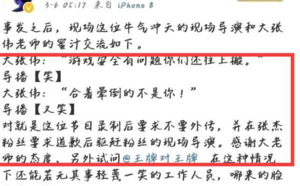 事后,张杰粉丝发文还原事情经过,称大张伟在和怒斥导播时,导播却一笑置之,并要求不要外传,让其他嘉宾和粉丝都十分愤怒。