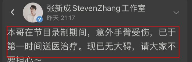 之后张新成工作室也和粉丝们报平安,但他并未详细说明受伤的原因,只是称在节目录制期间意外手臂受伤,一笔带过。