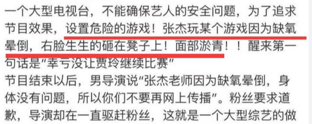 据悉,当时节目组为了追求节目效果,设置了一个危险的游戏,让嘉宾窝在箱子中,张杰也因为缺氧而晕倒,右脸生生的砸在凳子上,导致面部淤青!他醒来的第一句话便是“幸亏没让贾玲继续比赛”。