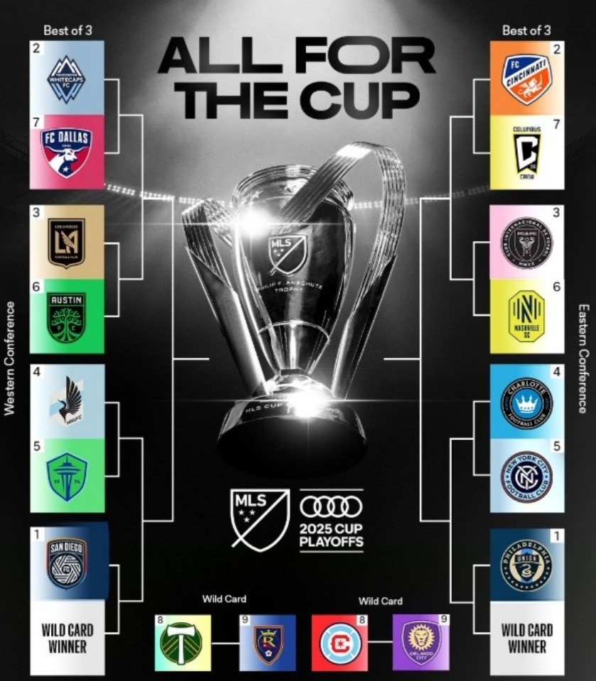 东部联盟方面,迈阿密国际将在季后赛首轮对阵纳什维尔SC,这将是常规赛收官战的翻版。其他对阵为:辛辛那提FC对阵哥伦布机员,夏洛特FC对阵纽约城,费城联合将面对芝加哥火焰与奥兰多城之间的胜者。
