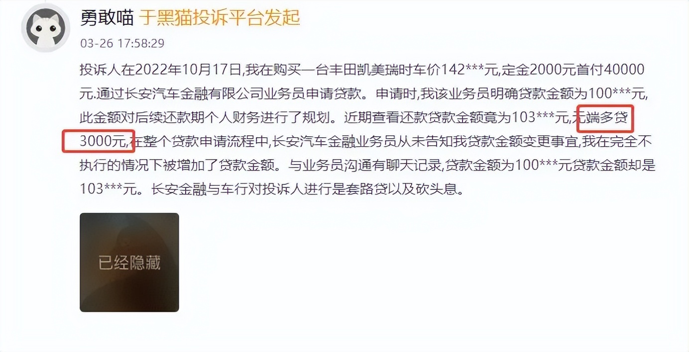 另有消费者投诉指出,长安金融存在涉嫌“砍头息”问题。有消费者在2022年10月购买车辆时,申请贷款10万元,实际贷款金额却变为10.3万元,无端多出3000元。