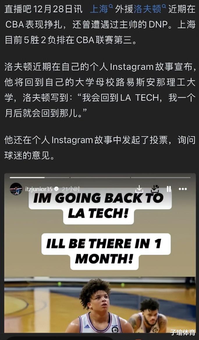 上海久事近期遇到的麻烦事也不小,由于得不到主教练卢伟的信任,外援洛夫顿欲离队,其在个人社交媒体上透露再过一个月便将回到NCAA母校打球,目前尚不知上海久事与洛夫顿所签合同是否为全额保障,如果签了一个赛季,洛夫顿无论再怎么打得不爽,也得履约,如果当初合同里有解约条款,双方就得坐下协商,至少卢伟得对洛夫顿展现出诚意,否则按照洛夫顿那不太成熟的心性,一走了之的可能性很大,那上海久事休赛期的所有努力便将付之东流。