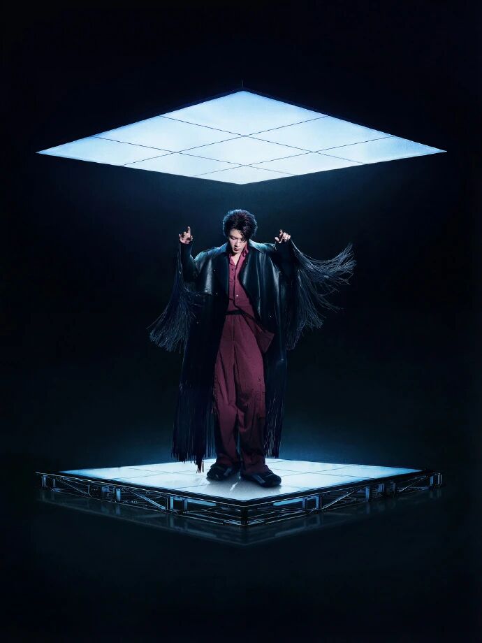 长款廓形不是 “拖到地的赘”,是垂坠面料裹着他的身形,像科幻隧道里的未来战袍—— 红黑撞色的暗调,没抢蔚蓝背景的风头,反而让 “科幻感” 有了奢牌的厚重质感,站在隧道里不是 “摆拍道具”,是 “未来世界里的质感焦点”;细节是 “暗纹压场”:FENDI 的低调暗纹没堆 logo,是科幻氛围里的 “高级感暗码”—— 不是靠元素喊 “我是科幻风”,是靠面料垂坠、廓形张力,让 “未来感” 长在奢牌的质感里。这波直接戳破:跨年科幻造型的高级,从不是 “堆未来元素”,是让 “奢牌质感接住科幻氛围”—— 他的 FENDI,是 “站着就有未来感” 的战袍,根本不用靠元素凑。