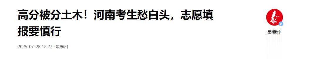 参考资料:最泰州 -2025-07-28 :高分被分土木!河南考生愁白头,志愿填报要慎行