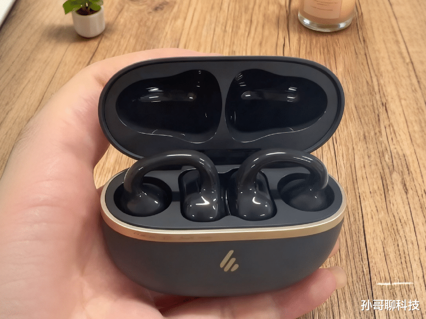 漫步者FitClip Ultra有黑色,白色,粉色三个版本,我选择黑色版本。皮纹充电盒握在手里防滑不沾染指纹,搭配精致金色腰线和品牌Logo非常有质感。耳机本体则采用亮面设计,不怕出汗和指纹污损耳机,黑色版本看起来也很干净。