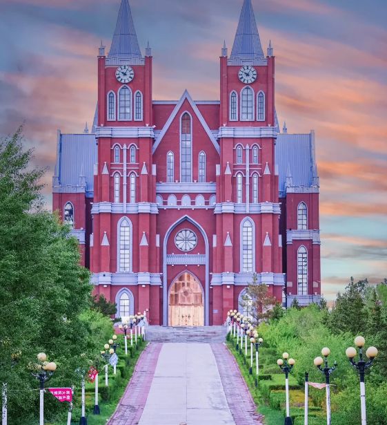 在满洲里,有一座浪漫的哥特式风格教堂——婚礼宫。这座教堂坐落在市区的东侧,远离了喧嚣的市区,给人一种宁静、祥和的感觉。教堂的建筑风格典雅庄重,有着浓厚的欧洲风情。当晚霞映红了天空,整个教堂被笼罩在一片金色的光芒中,宛如童话般的世界。