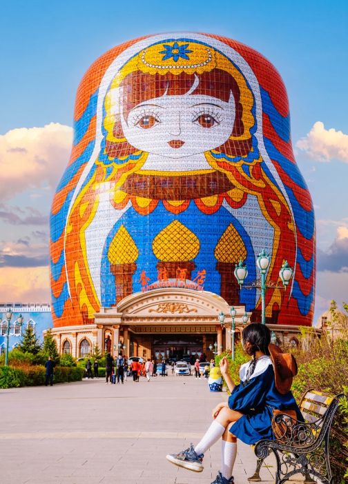 这个套娃内部为俄式餐厅和演艺大厅,外部彩绘由代表着中俄蒙三国的美丽女孩组成,主体套娃周围还有8个功能性套娃、200个代表全世界不同国家和地区的小套娃和30个色彩缤纷的俄罗斯复活节彩蛋。