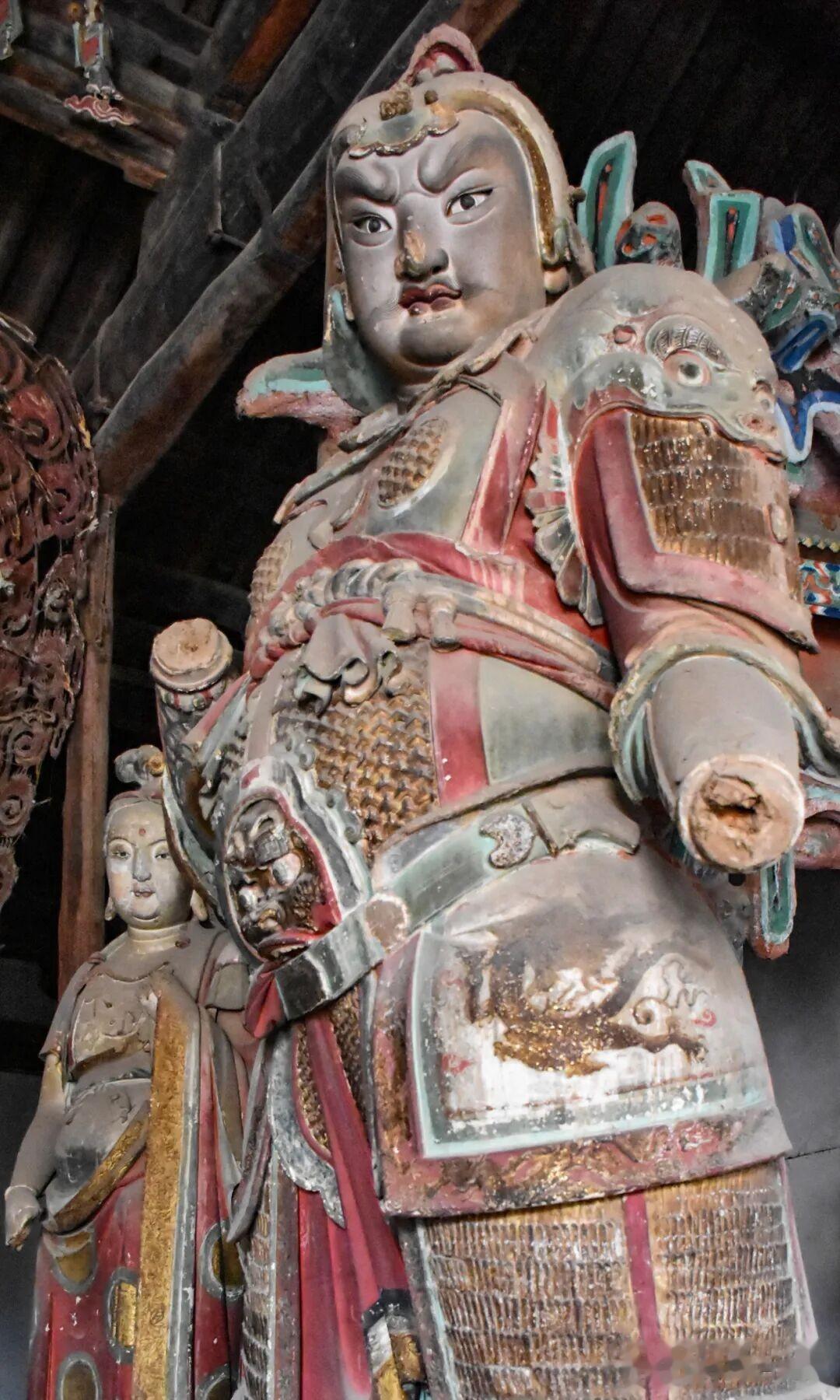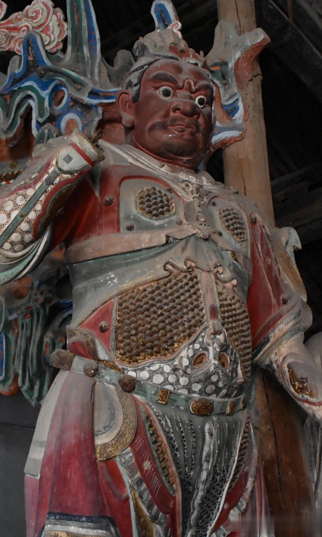 佛坛之上,除了华严三圣,还有二弟子阿难、迦叶,两尊胁侍菩萨,以及两尊气势威猛的金刚,每一尊都塑造得极具神韵,没有丝毫敷衍。阿难尊者身形俊朗,面容清秀,带着年轻修行者的纯粹与虔诚,姿态恭谨,仿佛正静心聆听佛祖教诲;迦叶尊者则截然不同,面容沧桑,眉眼间藏着历经世事的沉稳,姿态与神情都格外耐人寻味,是整组彩塑里最让人忍不住驻足琢磨的存在。胁侍菩萨身姿优雅,气质温婉,静静侍立在侧,为庄严的佛坛添了几分柔和;两尊金刚则威风凛凛,身形健硕,神情威猛,目光如炬,浑身透着守护的力量,稳稳护住这方佛国净土,刚与柔、庄严与威猛、沉静与灵动,在佛坛上完美交融,没有一丝违和,每一尊塑像都各司其位,又相互映衬,共同构筑起完整而和谐的佛国世界,让人站在殿前,能真切感受到信仰的力量,也能感受到古代雕塑艺术的巅峰水准。