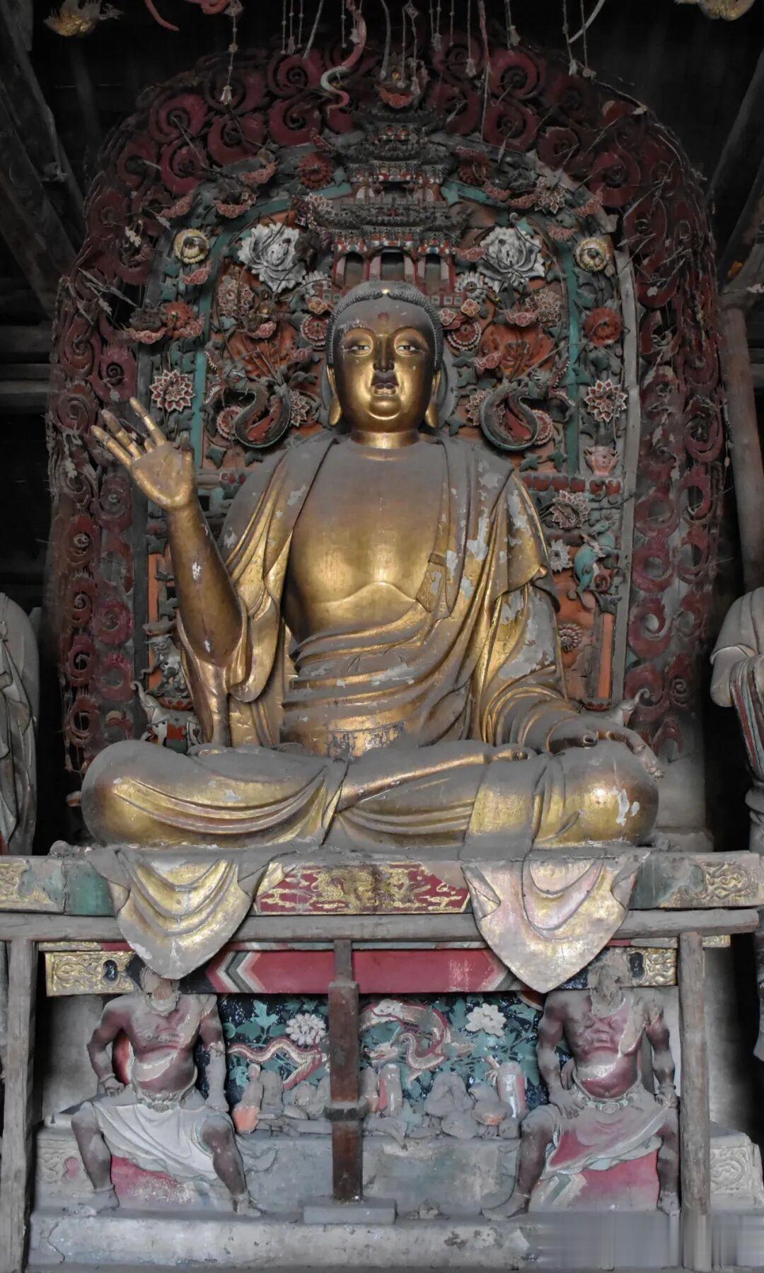 洪福寺的核心,就是这座历经风雨依旧稳固的金代大殿,殿内佛坛上一字排开九尊宋金时期的彩塑,这种群塑供奉的形式,在早期寺院里并不少见,可像这样完整保留、气韵如初的,实在屈指可数,九尊塑像没有丝毫拥挤感,反倒排布得舒展从容,整体气度恢弘,每一尊各有姿态,却又浑然一体,共同撑起了殿内的佛国气象,没有刻意的雕琢感,也没有后世翻新的匠气,就是岁月与匠心相融的本真模样,站在其中,仿佛能触摸到宋金时代的审美与信仰,能感受到当时工匠们落笔时的虔诚与笃定,他们不是在完成一件工艺品,而是在把心中的佛国世界,一点点捏进泥土、敷上色彩,让冰冷的黏土有了温度,有了神性,也有了人间的烟火气。