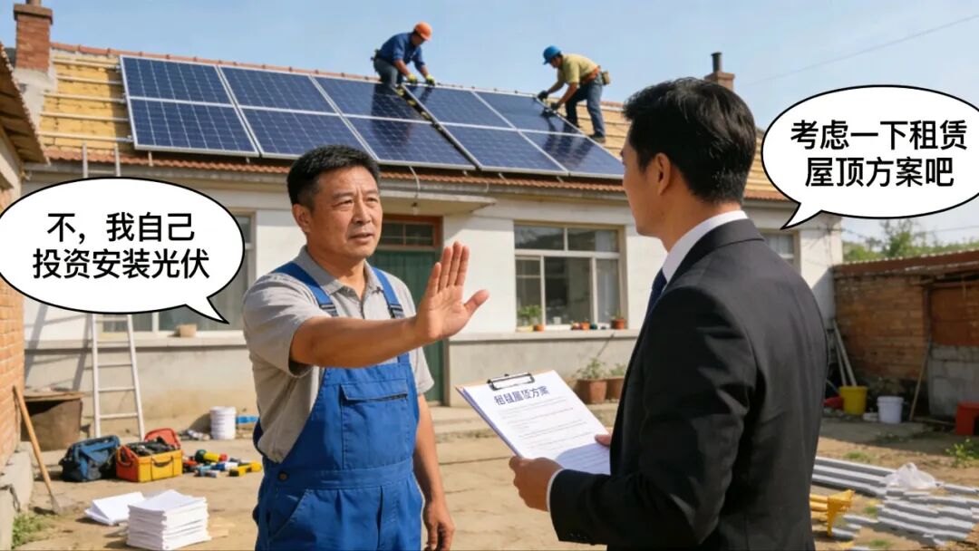 在农村自建房屋顶出租屋顶的情况不要干,这个有风险。如果要在自建房屋顶安装光伏并网发电,我的建议就是自己完全投资,这个更有保障。